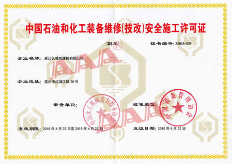 我司榮獲“中國石油和化工裝備維修(技改)”資質(zhì)證書及安全施工許可證